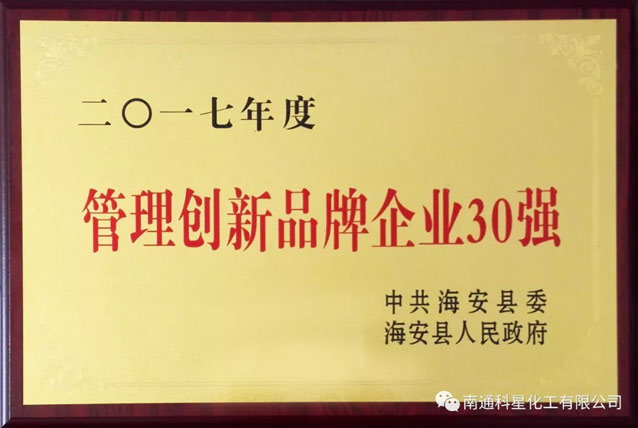 南通科星化工有限公司榮獲“管理創(chuàng)新品牌企業(yè)30強(qiáng)”、“工業(yè)百強(qiáng)企業(yè)”兩大榮譽(yù)稱號,這對科星來說既是榮譽(yù)也是動力。