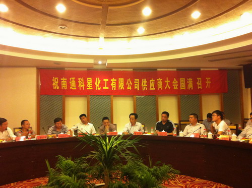 首先請代表們到公司參觀生產(chǎn)、研發(fā)、倉儲、辦公現(xiàn)場,在公司多功能會議室,代表們觀看了公司產(chǎn)、供、銷和公司發(fā)展史影像片,然后到主會場——海安王府賓館四樓召開了全體供應商會議,同時邀請了地方政府、金融系統(tǒng)領(lǐng)導一同參加。會上,吳總首先介紹了公司近年來發(fā)展情況,接著就原料的質(zhì)量等問題提出了我公司的要求。最后由上海甲基、南京古田化工、泰州東興物資、南通仁和化工供應商代表發(fā)言講話。