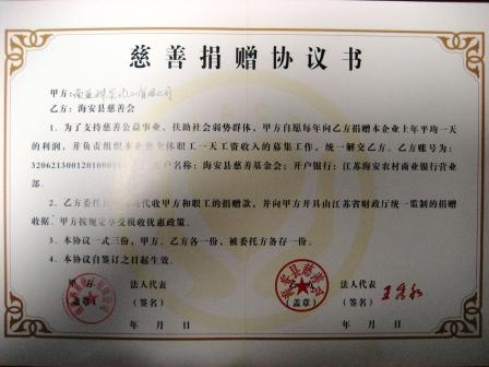 吳總不僅是優秀的企業家,而且是一位慈善家。每年對教育、社會等機構獻愛心。12月16日,吳總又和海安縣慈善會簽訂了《慈善捐贈協議書》。