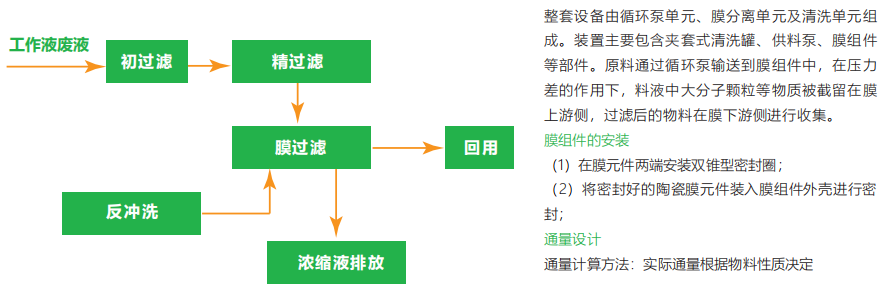 該設備是以無機陶瓷材料經特殊工藝制備形成的非對稱膜。具有分離效率高、化學穩定性強,耐高溫,抗污 染,效果穩定,能耗低的優點,廣泛應用于清洗劑、切削液、防銹劑、金屬表面處理劑的分離和工作液再利用。